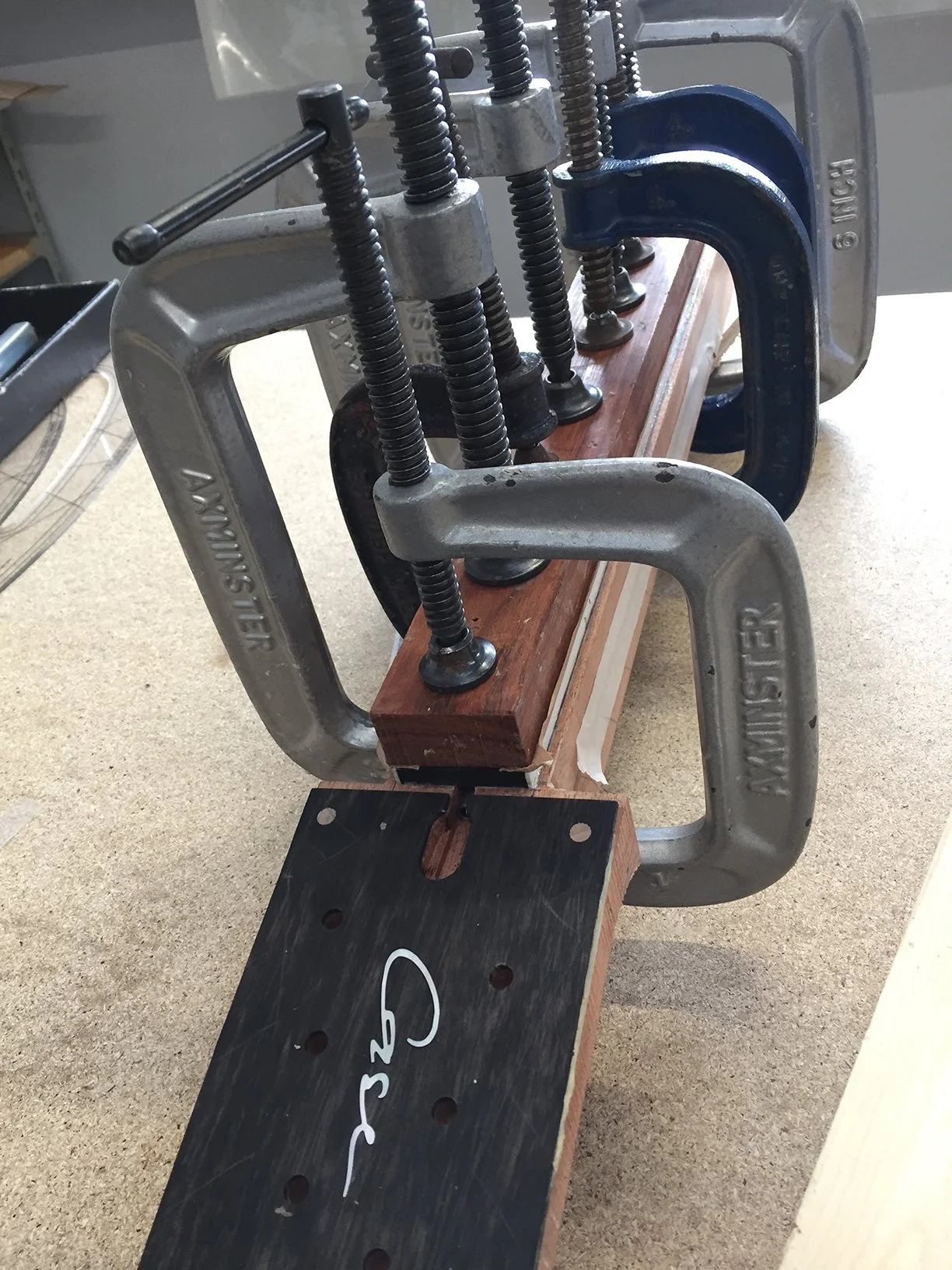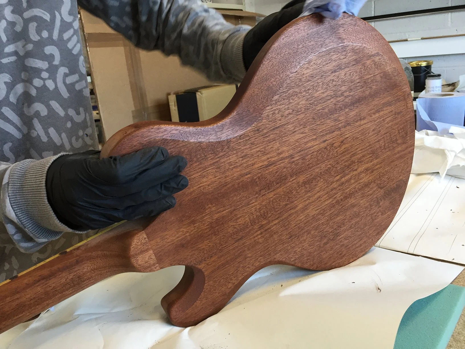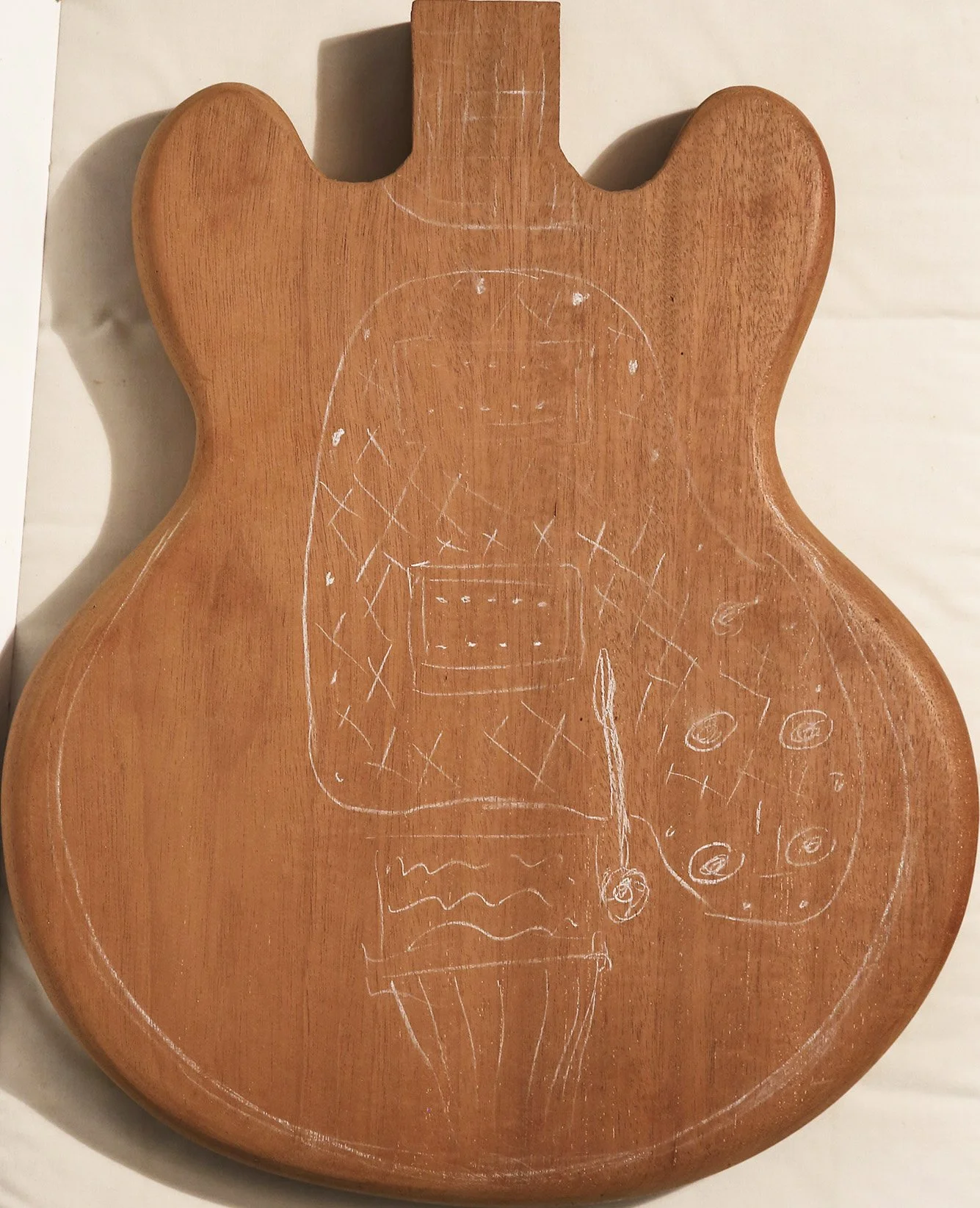 Charles had sketched his idea in chalk onto the roughly cut body - a beautiful piece of Brazilian mahogany. It was too heavy in its presented form so it was agreed that the overall size would be reduced and the body chambered.