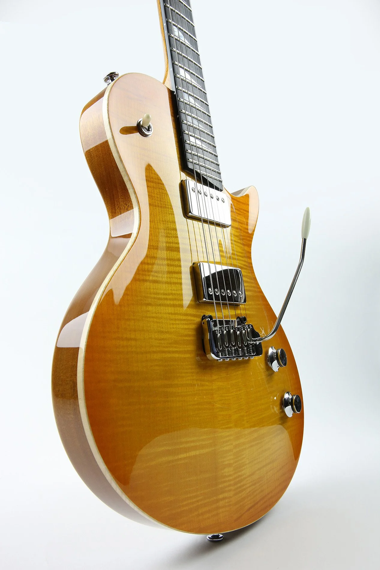 A carved premium grade maple top on a chambered mahogany body, gives this guitar an amazing natural sustain and resonance while keeping it light. The neck is carved from one piece of quarter sawn mahogany, creating a very stable neck with a great feel. The fingerboard has slightly rolled edges with a choice of either rosewood for it's warm tone, or ebony for it's slightly brighter response and durability. Hand applied wood stains enhance the highly figured maple top to create a guitar that looks every bit as good as it sounds.