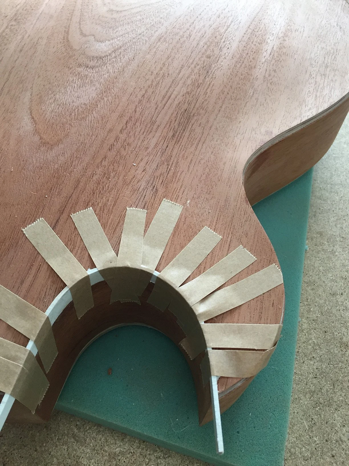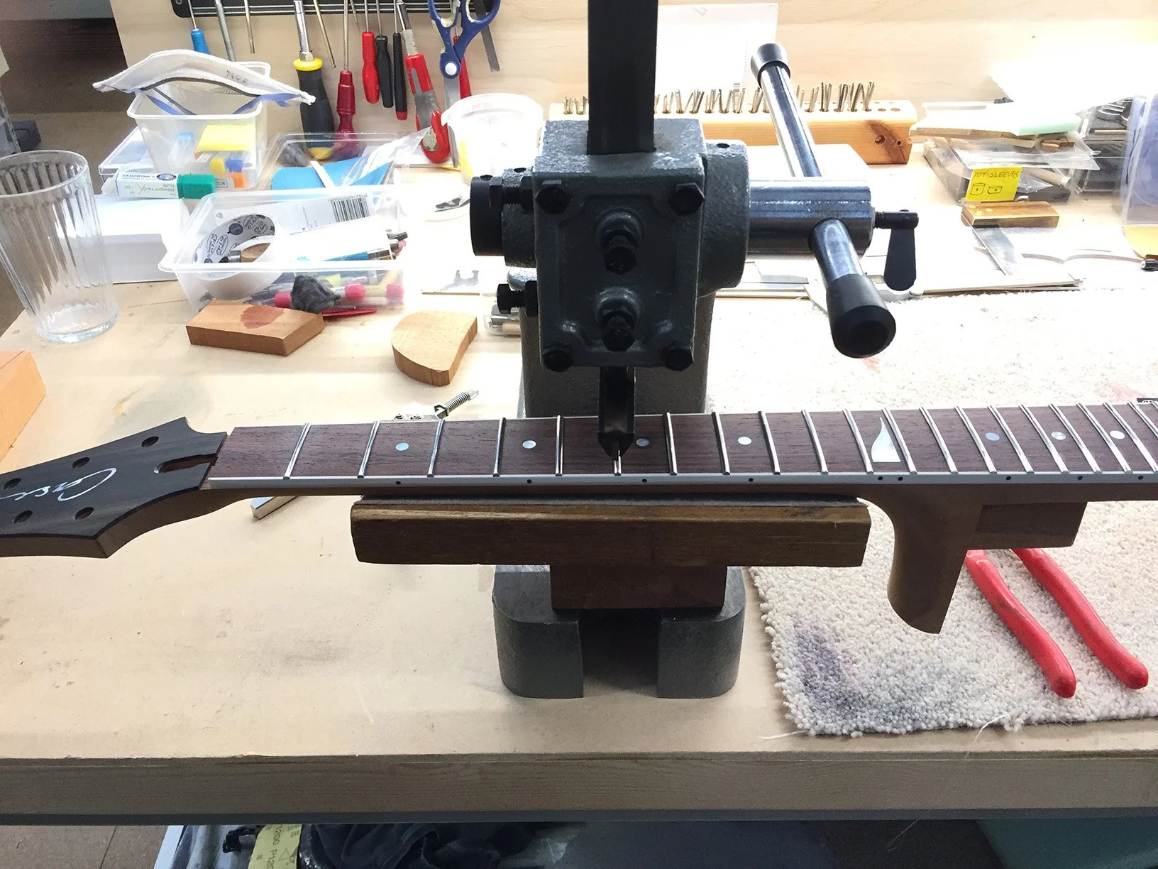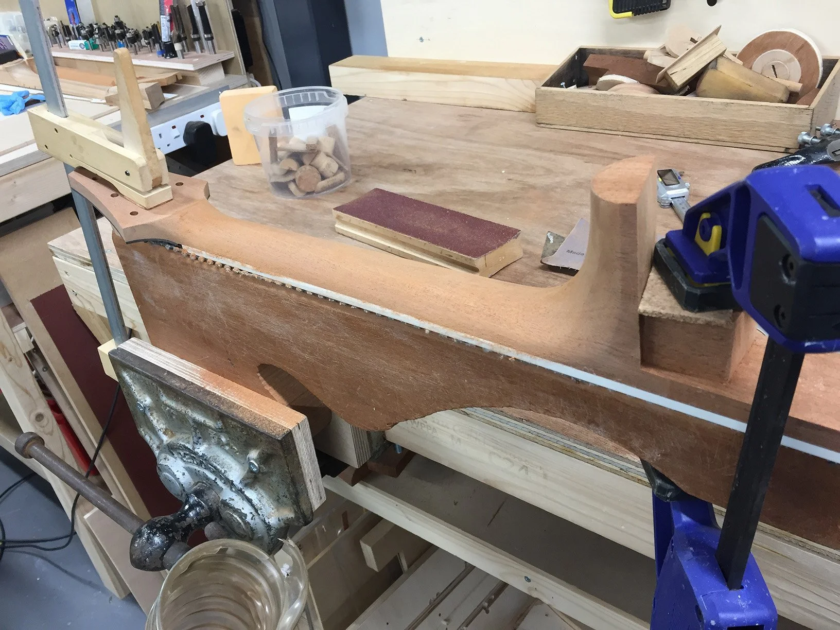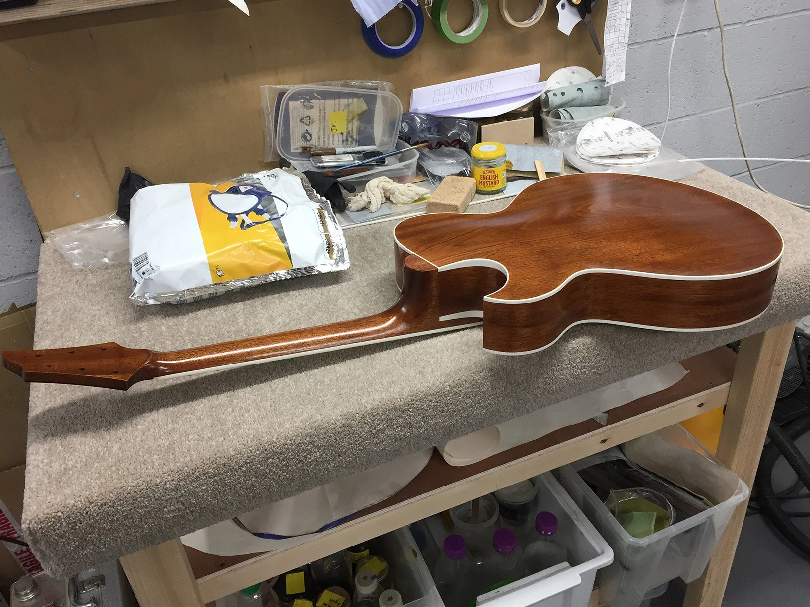 Working with Jon, we specified my idyll. It’s a single pick up (Bare Knuckle Mule) on a 3’’deep, 16’’ wide laminate body with Gibson 24.5” scale length. Strings 12-52mm.