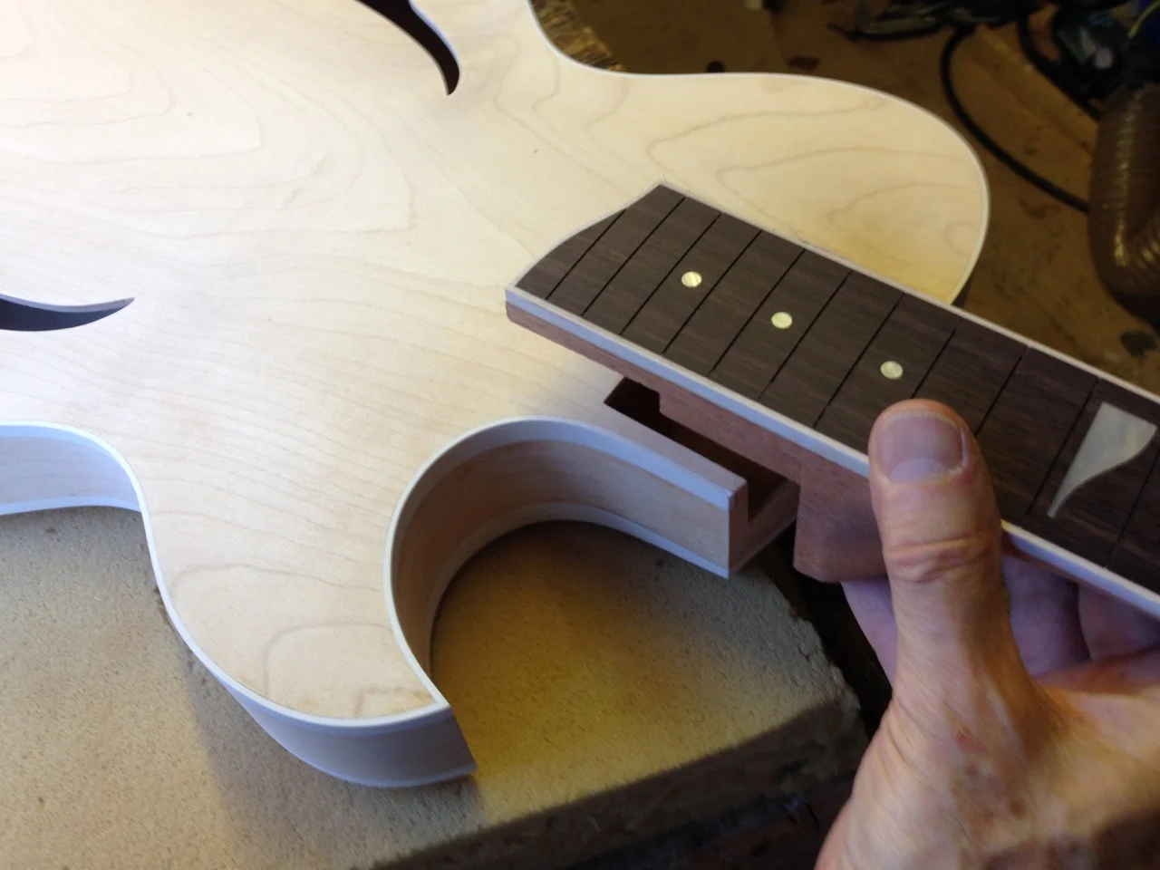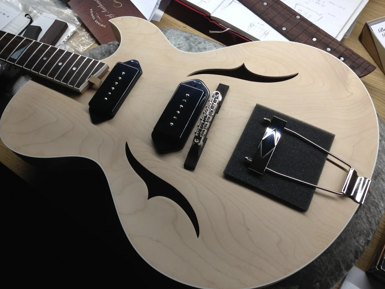 We were very excited to be working with talented guitarist and composer Richard Rozze to build him a J3 Florentine 'Thinline' hollow body. Richard's vintage 1956 Gibson ES 225 became fragile and with it's increasing value, made taking it on the road more of a risk. The brief was to recreate the feel and sound of his beloved Gibson 225 but with the shape of a J3 florentine to withstand the rigours of live and recording work.